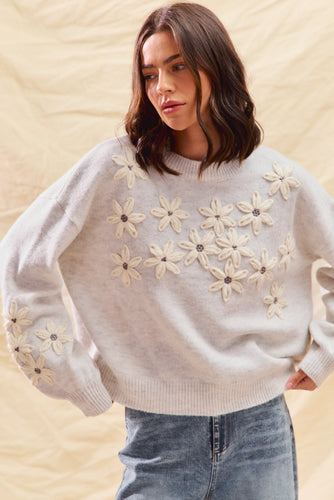 Grey Embroidered Floral Sweater