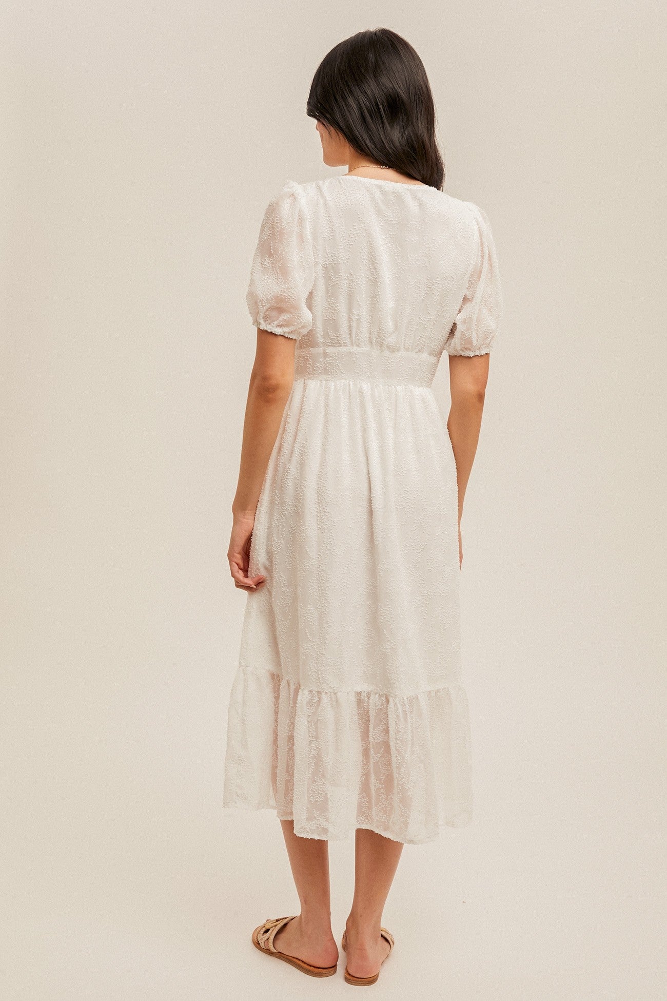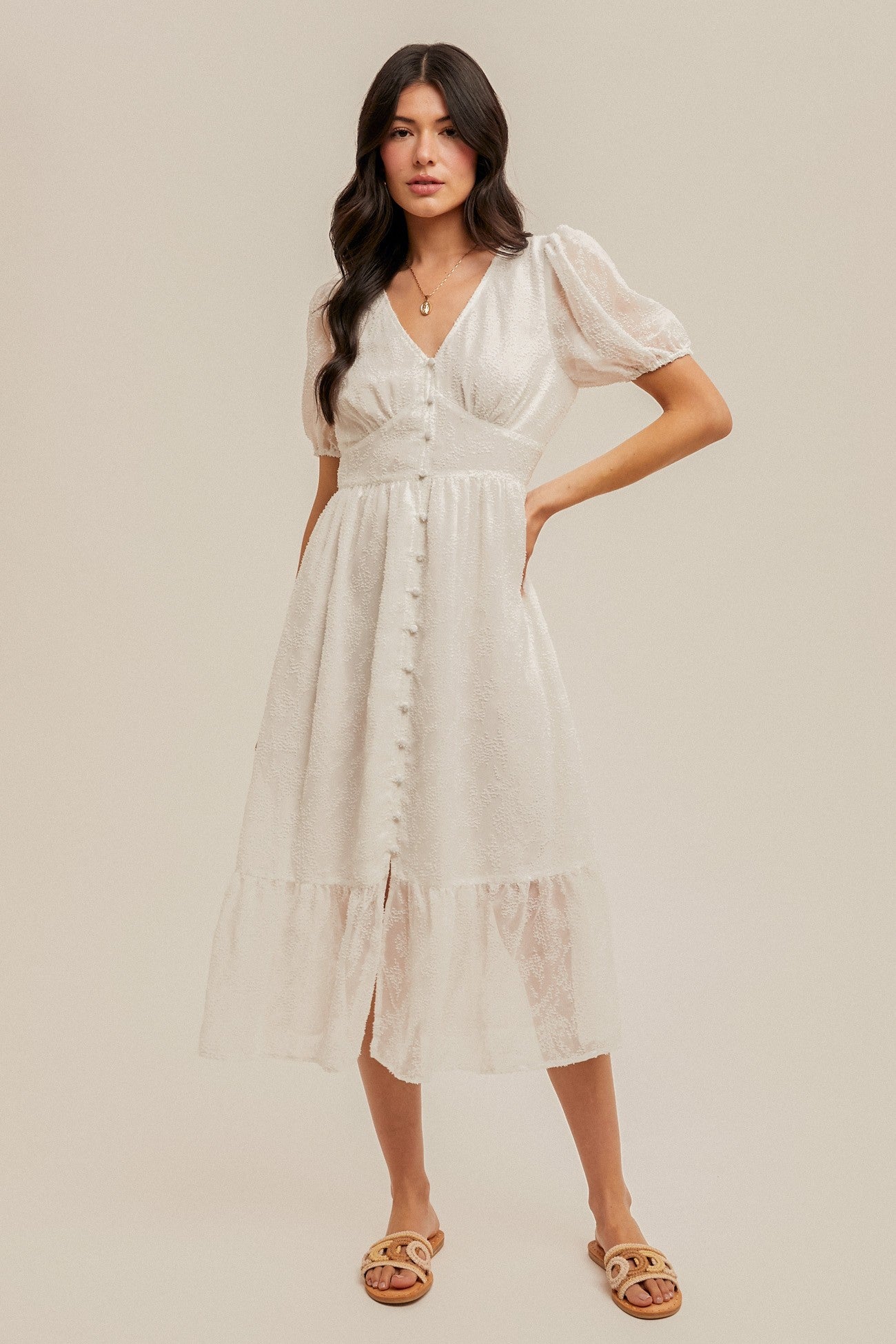 JACQUARD PUFF SLEEVE BUTTON DOWN MIDI DRESS -SELF:100% POLYESTER -LINING:100% POLYESTERThe model is wearing a small.