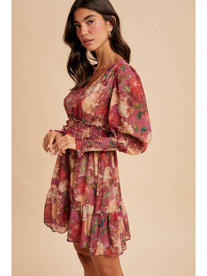 Darling floral mini dress features: - Floral chelsea chiffon fabrication - Smocked waistband with ruffled detail - Smocked sleeve ends - Flounced hem - Fully lined