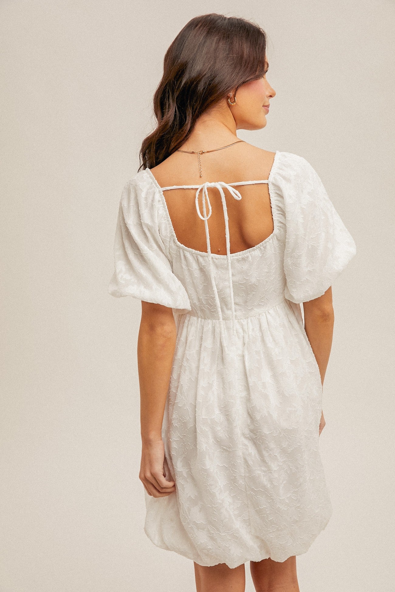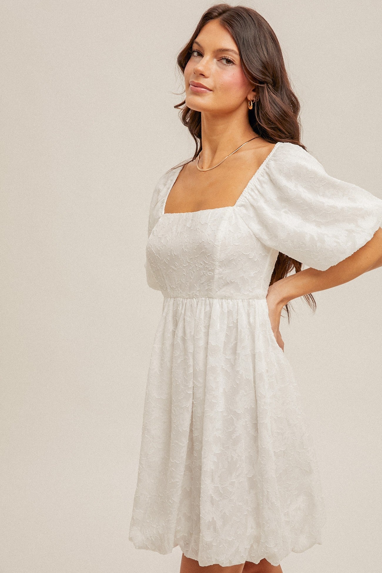 CHIFFON JACQUARD PRINT SQUARE NECK BUBBLE DRESS -DRESS HAS LINING -100% POLYESTER -LINING:100% RAYONThe model is wearing a small.