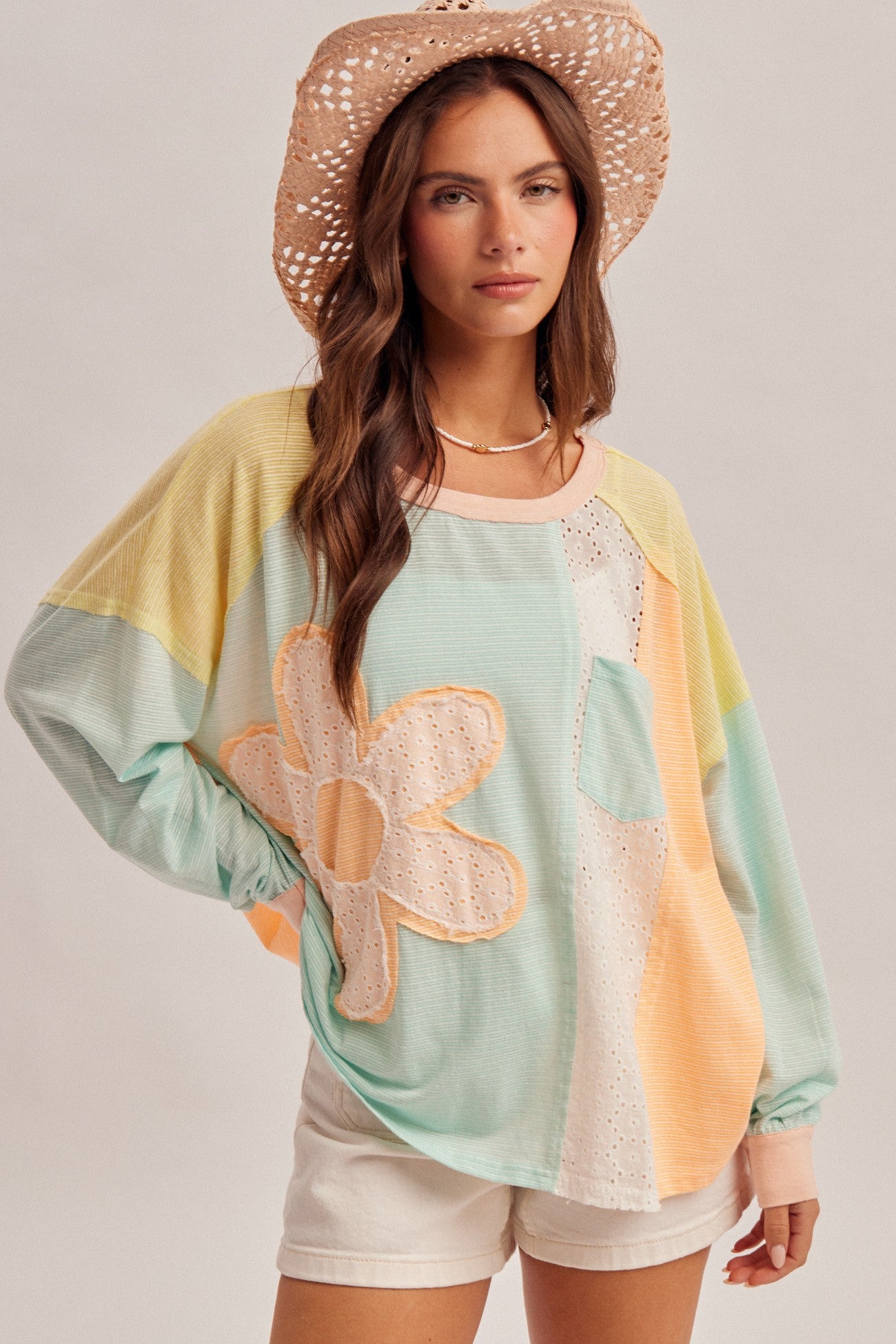 DAISY PATCH COLOR BLOCK LOOSE FIT LONG SLEEVE TEE
