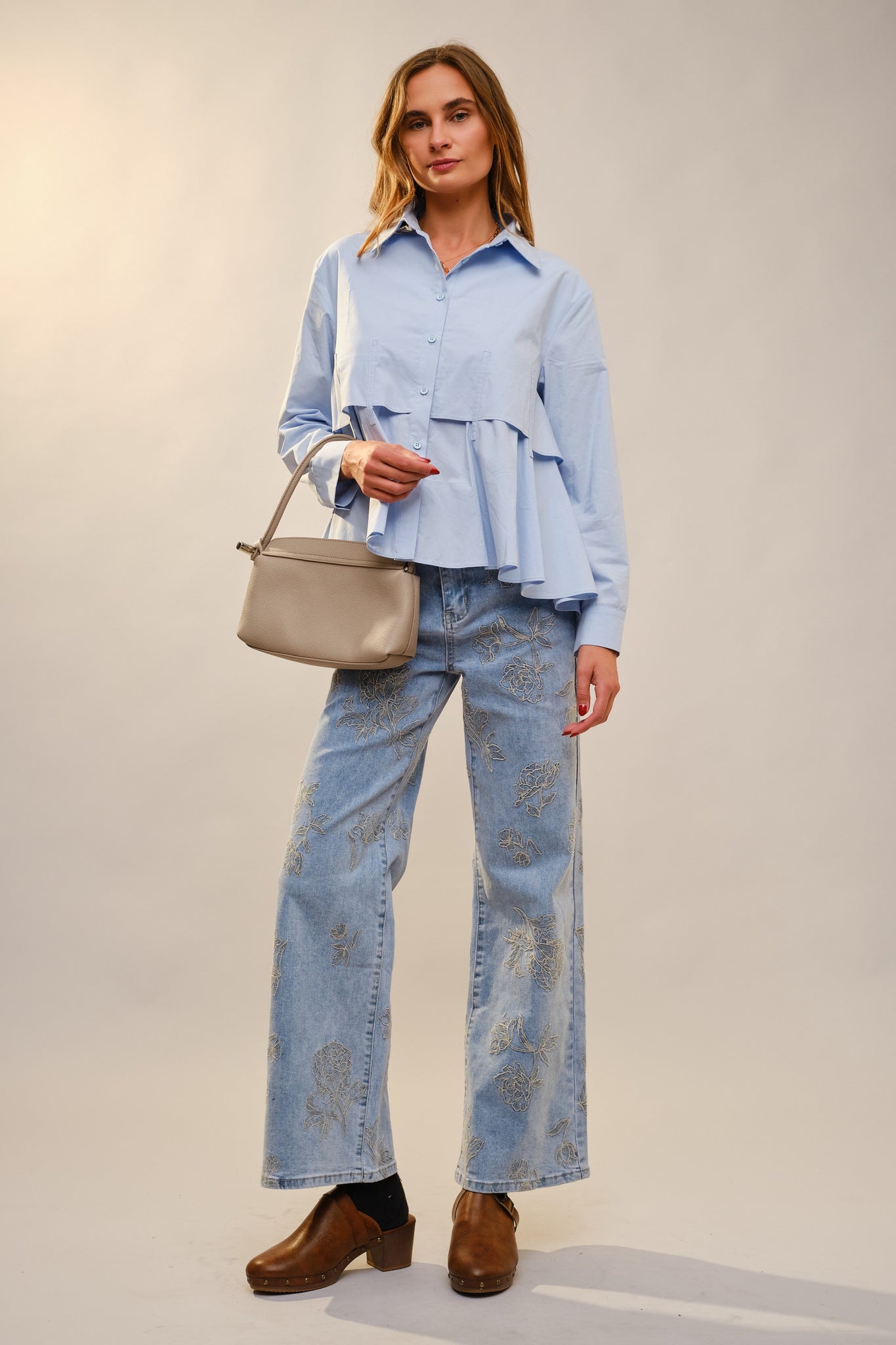 A soft washed denim with delicate all-over floral embroidery that adds a romantic vintage charm. Designed in a flattering high-rise fit with a subtle flare leg for an effortlessly elongating silhouette. The stretch-blend fabric offers comfortable wear while keeping its shape.