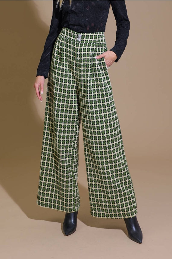 A tweed pant featuring front closure with jewel button, side pocket and wide leg Details: Self : 100% Polyester Lining : 100% Polyester Size & Fit - Model is 5`8" And Wearing Size Small - Measurements Taken From Size Small - Approx. Length: 42" Inseam 29"