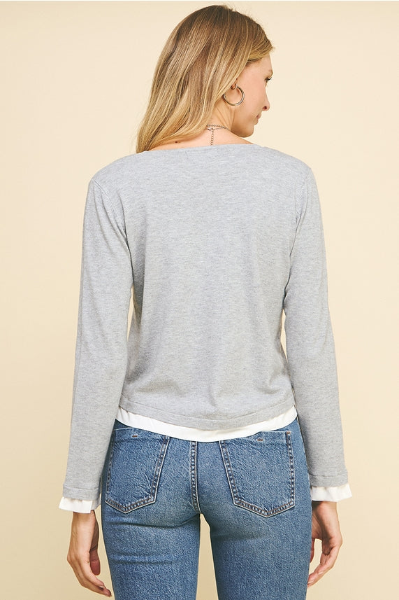 Knit sweater & woven combo Button down Long sleeves V-neck Model wears a size small