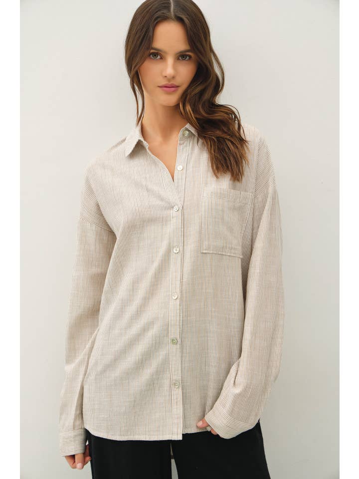 * hairline stripe * stripe * over-sized fit * shirt * button down * chest pocket * oversized fit * dropped shoulder * back yoke * collar * casual * comfort