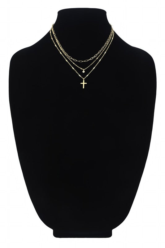 Brass 3-Layered Necklace with cubic zirconia and Cross Pendant with lobster clasp closure
