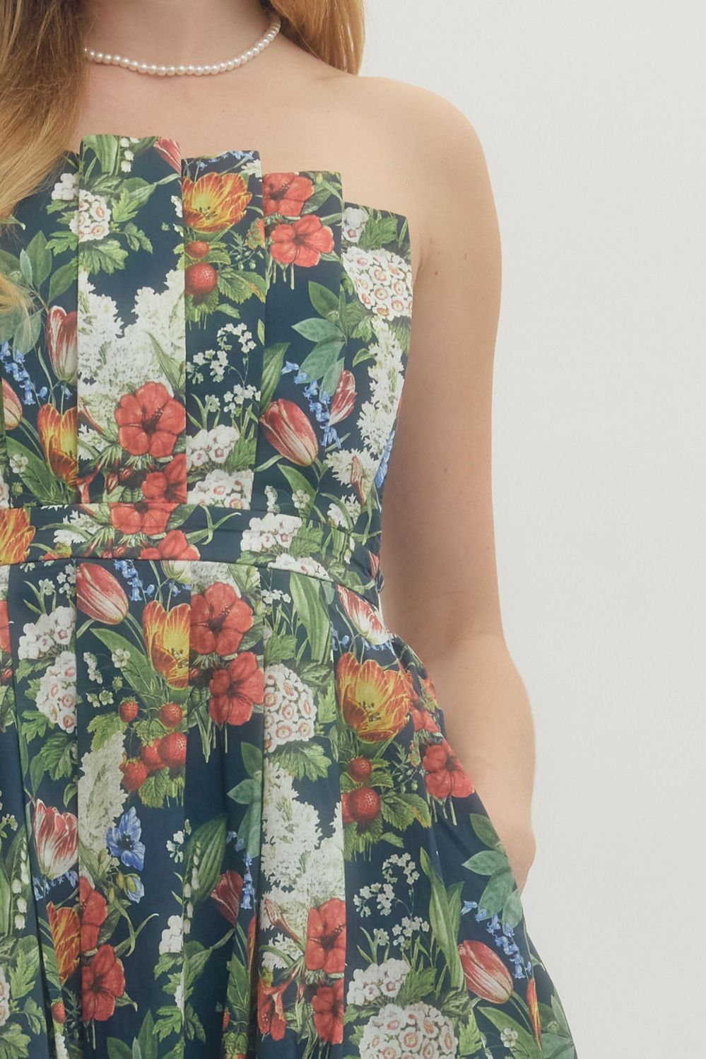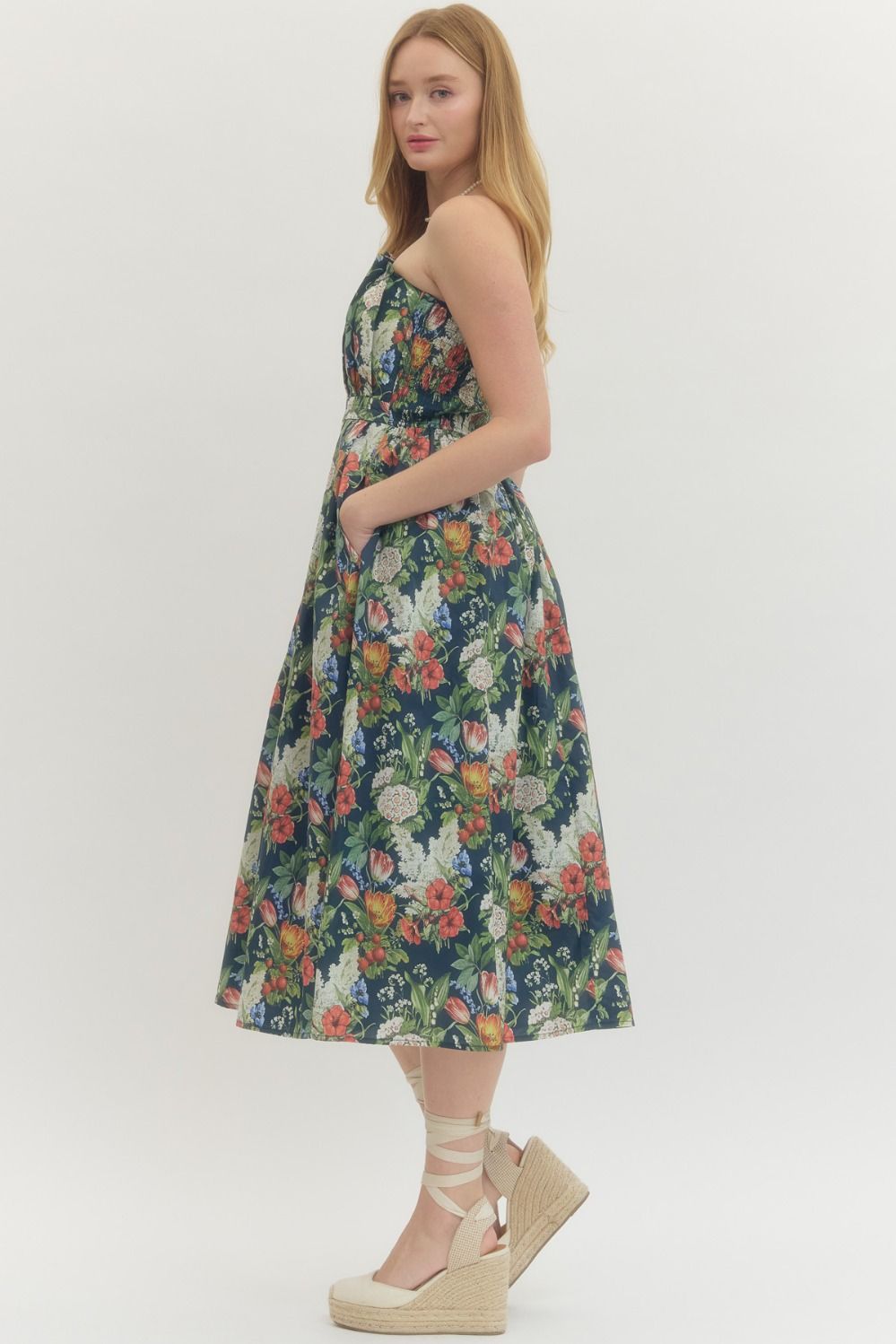 Floral print strapless midi dress featuring pleated neckline and smocked back. Side pockets. Back zipper closure. Lined. Woven. Non-sheer. Medium weight.