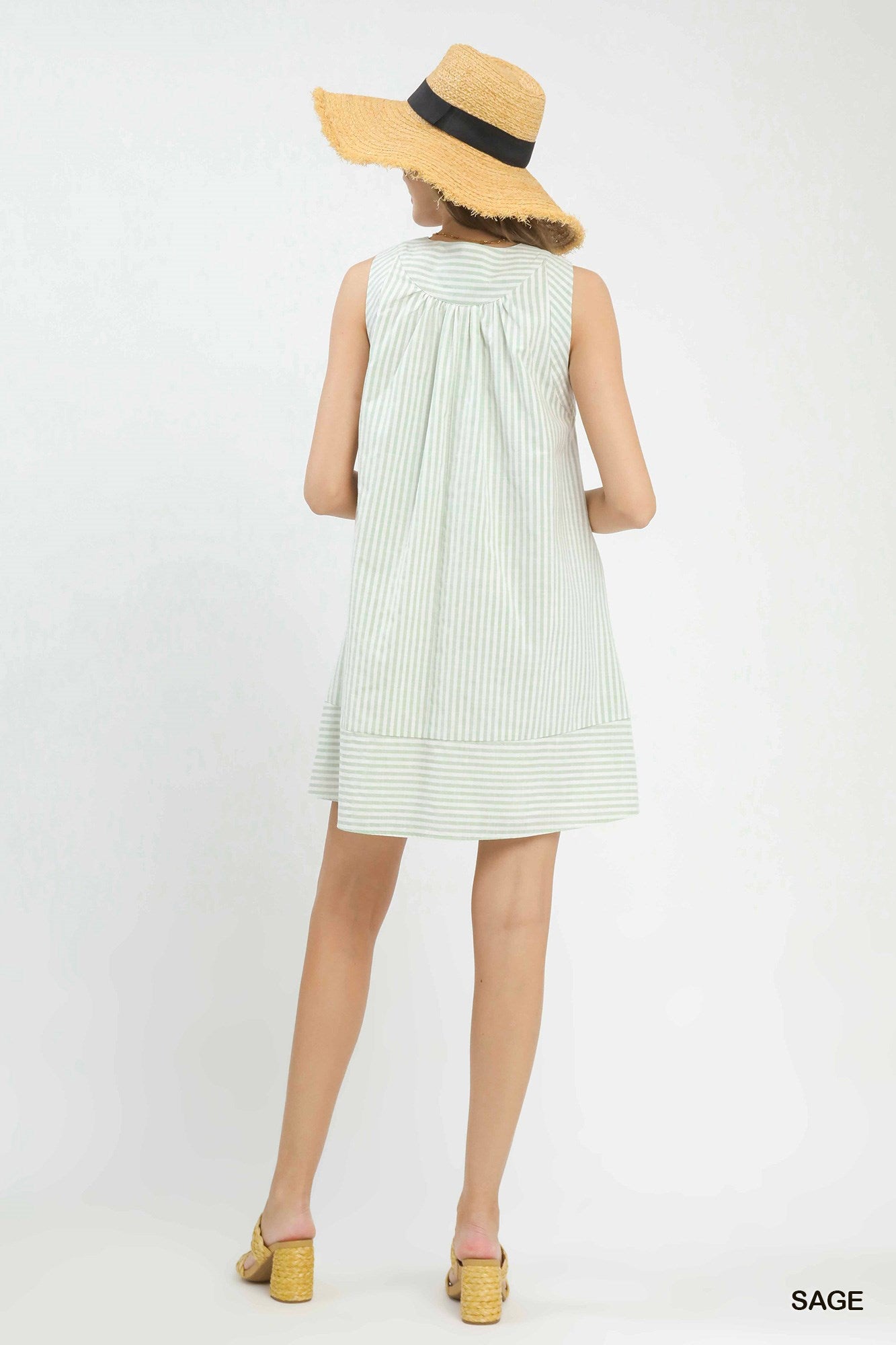 Sleeveless A-Line Stripe Mini Dress w/ PocketsKey Features• A-line mini dress• V-neck• Sleeveless• Side pockets• Mini dress• LinedFit & Model Notes• Model is 5'10" and is wearing a small.• All Measurements are approximate.Fabric Contents• 75% Cotton• 25% Polyester