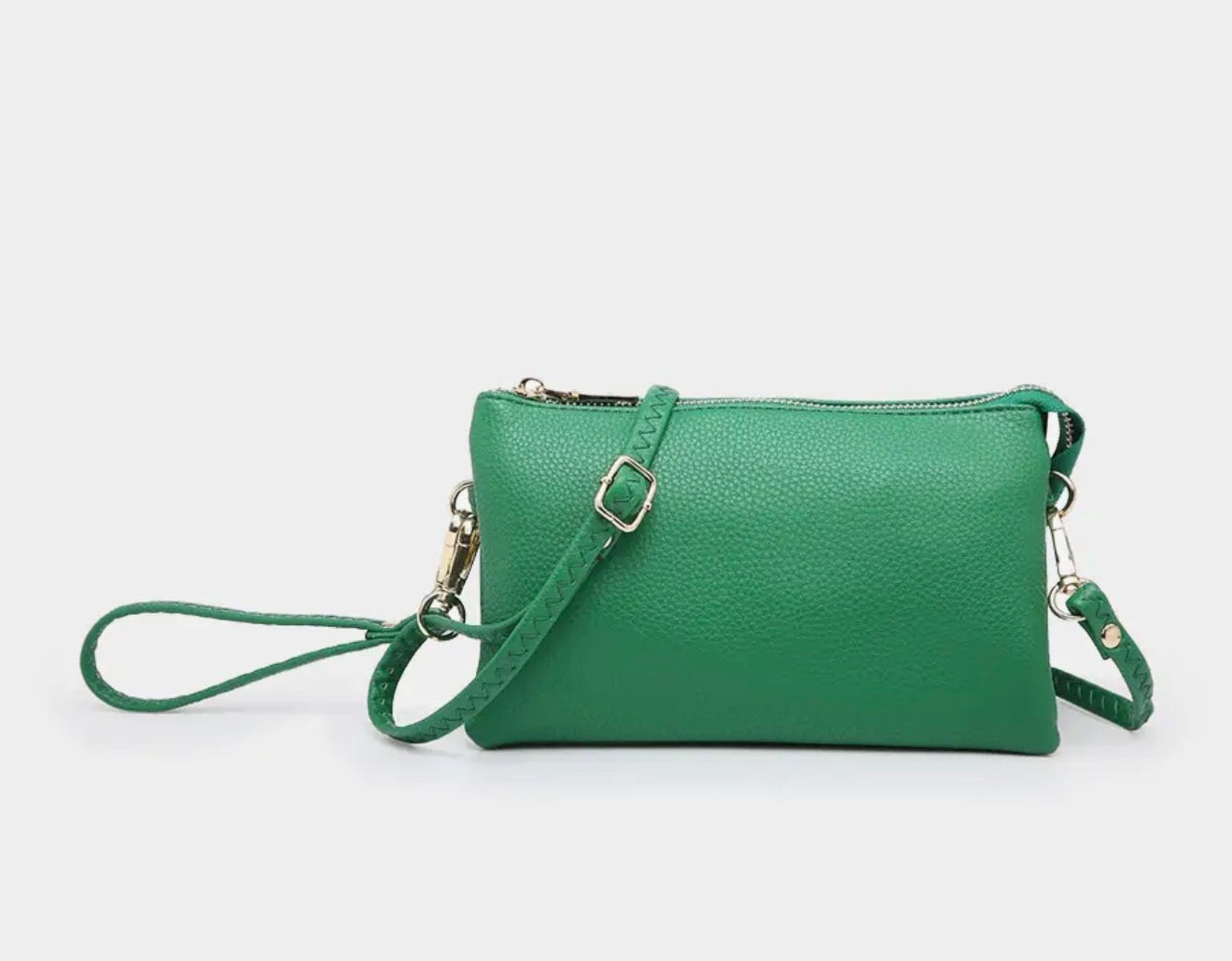 Top zipper closure Two major compartments and 1 middle zipper pocket 2 slip pockets and 6 cardholders Detachable wristlet Adjustable shoulder strap Herringbone lining Gold or silver-tone hardware Vegan leather Dimensions: 9” L x 1.5” D x 5” H