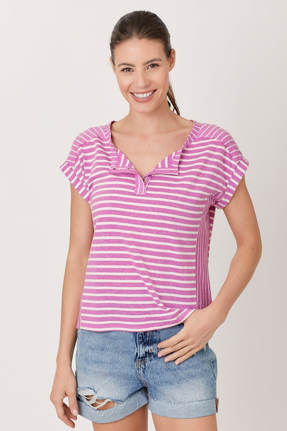 Multistripe Roll-Up Sleeve Top Short sleeves Button trim Round neck -Model wears: S / Model height: 5` 9"