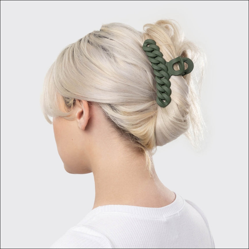 Step out looking effortlessly stylish with these sustainable chain claw clips. Our elevated take on the classic hair clip lets you twist your hair up with zero effort while making an on-trend statement. Crafted with recycled materials, these eco-friendly clips let you feel good about looking good. Choose from two sets of versatile neutrals to coordinate with all your favorite outfits. These hair clips are made from recycled materials. Each clip measures 11 cm W x 5 cm H x 3.5 cm