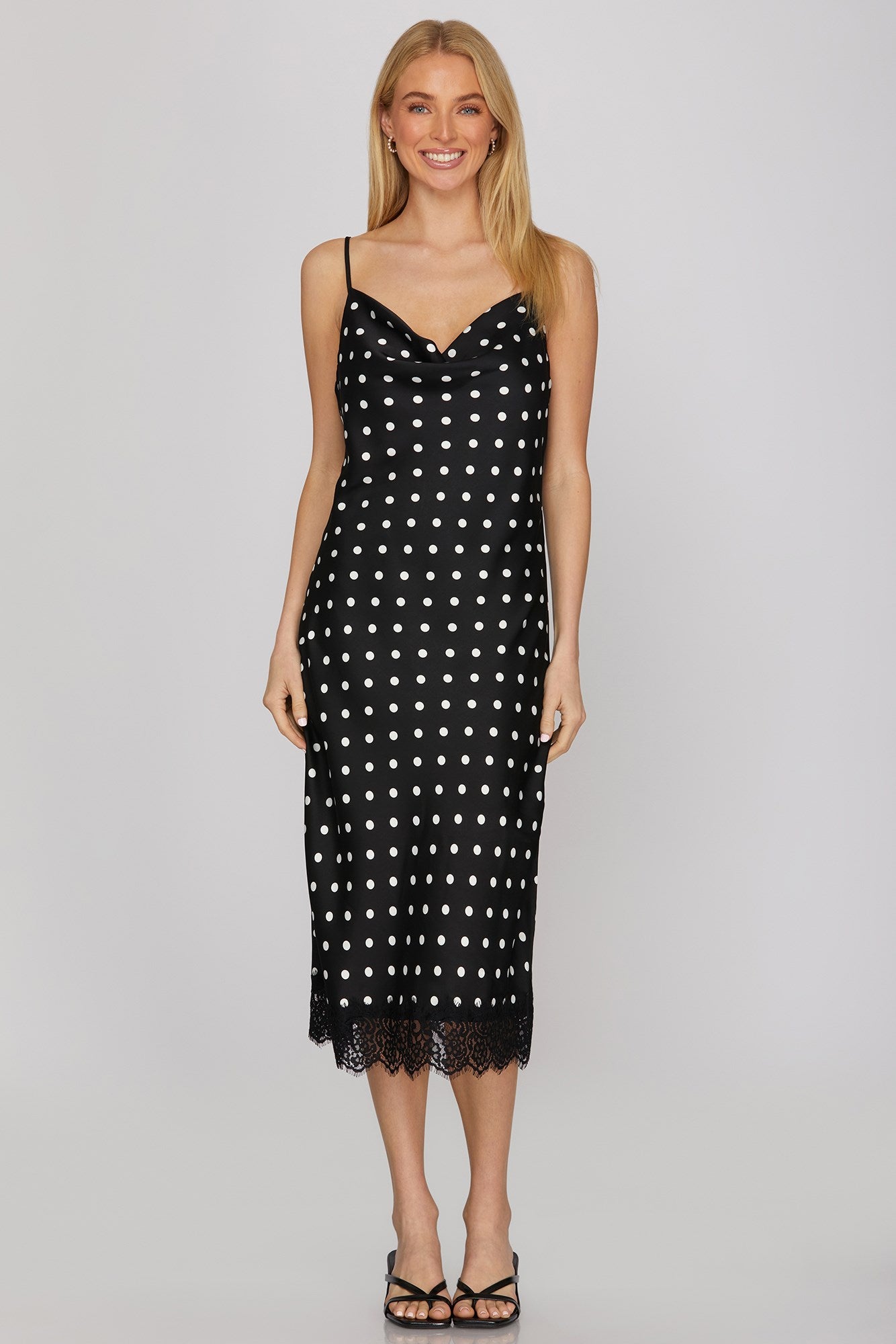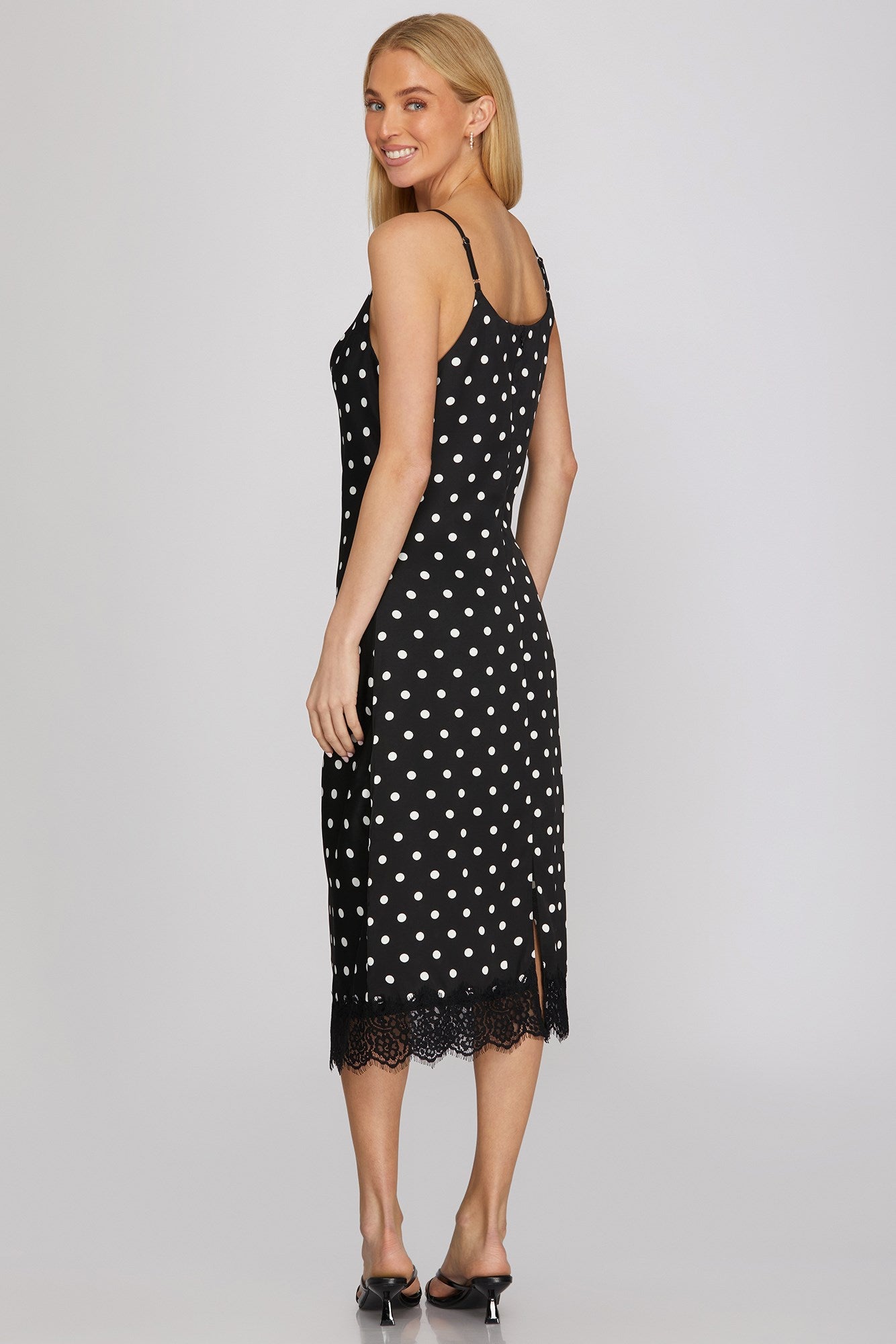CAMI WOVEN POLKADOT PRINT MIDI DRESS WITH HEM LACE DETAIL