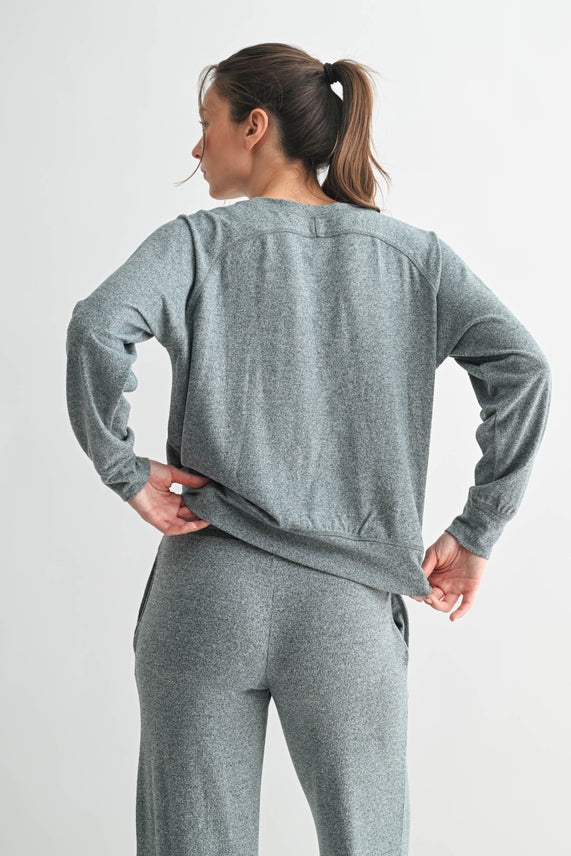 Crafted from our best-selling brushed Hacci fabric that feels as light and airy as a cloud, this Henley-style long sleeve is the perfect blend of comfort and casual charm. Designed with a slight V-neckline, it’s soft, breathable, and effortlessly easy to wear—whether you're lounging or on the go. Luciana is 5'9", a size 2, and is wearing an S 95% polyester, 5% spandex