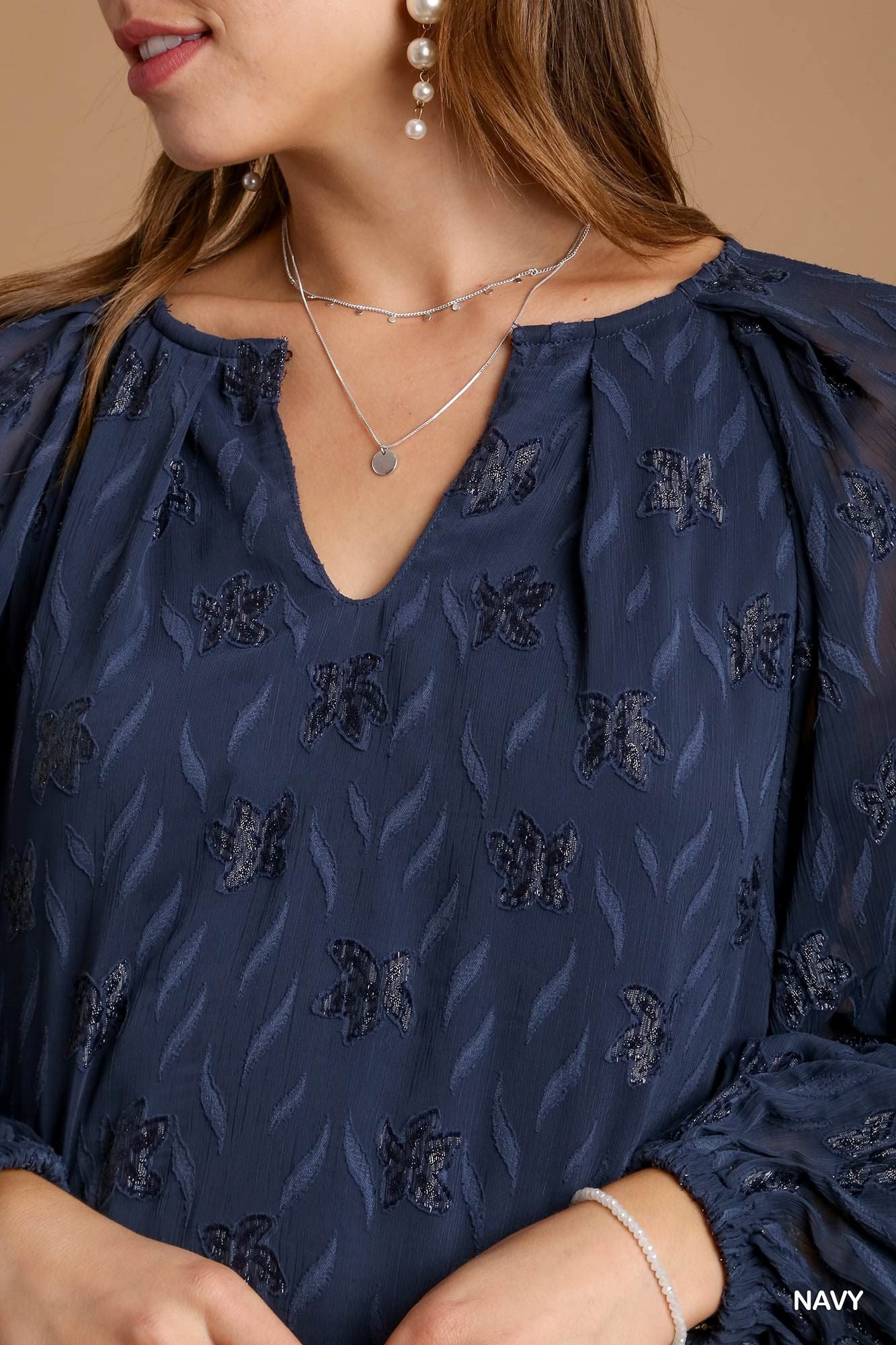 Metallic Floral Jacquard Long Sleeve Lace TopFit & Model Notes:• Model is 5'9" and is wearing a small.• All Measurements are approximate.• Not Lined.Fabric Contents:• 100% Polyester