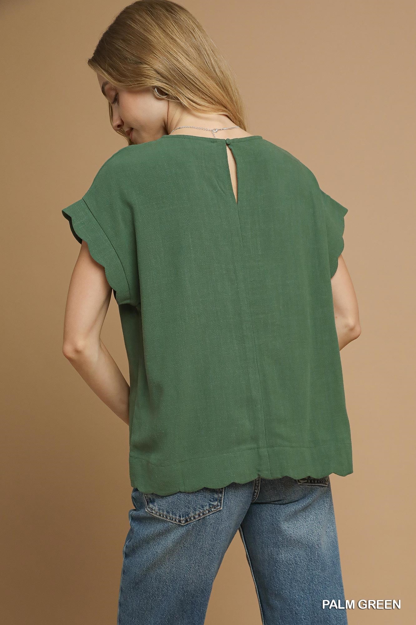 Scallop Hem Linen Blend TopKey Features• Linen Blend• Scallop-edged sleeves and hem• Classic round neck• Relaxed and breezy silhouette• Not LinedFit & Model Notes• Model is 5'10" and is wearing a small.• All Measurements are approximate.Fabric Contents• 55% Linen• 45% Cotton